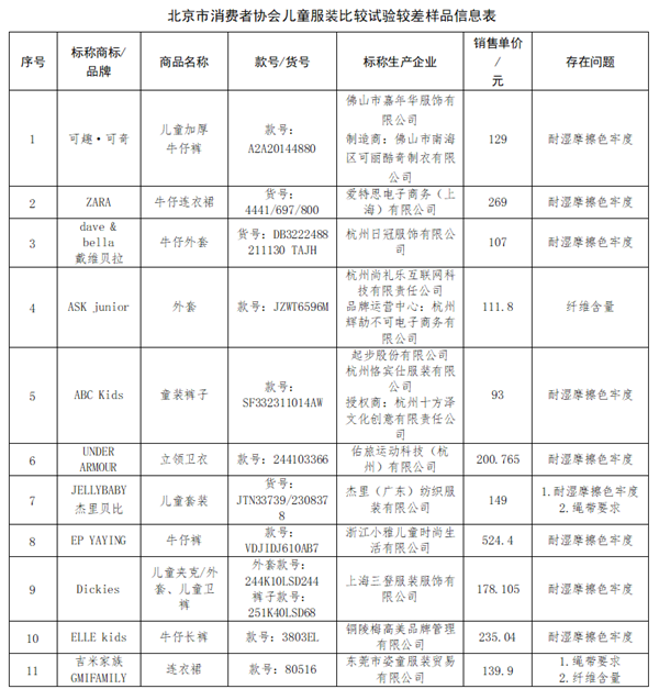 色牢度差的商品在使用过程中容易变色或者染料脱落沾染别的衣物,影响产品的美观,且脱落的染料分子可能通过皮肤被人体吸收而对健康造成危害。本次比较试验依据相关产品标准和GB 31701-2015对样品的耐汗渍色牢度、耐干摩色牢度、耐湿摩色牢度、耐光色牢度、耐光汗复合色牢度、洗液沾色程度进行测试比较。本次比较试验中,在相关标准有考核耐湿摩擦色牢度要求的69件样品中,可趣•可奇、ZARA、dave & bella戴维贝拉、ABC Kids、UNDER ARMOUR、JELLYBABY杰里贝比、EP YAYING、Dickies、ELLE kids等9个品牌各有1件样品的测试结果存在问题。